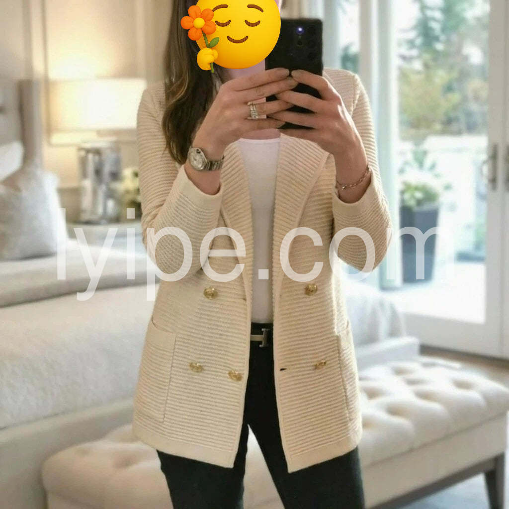 Very impressed with the quality of this sweater. It feels heavy and well-made, not flimsy at all. The double-breasted design is super trendy right now.